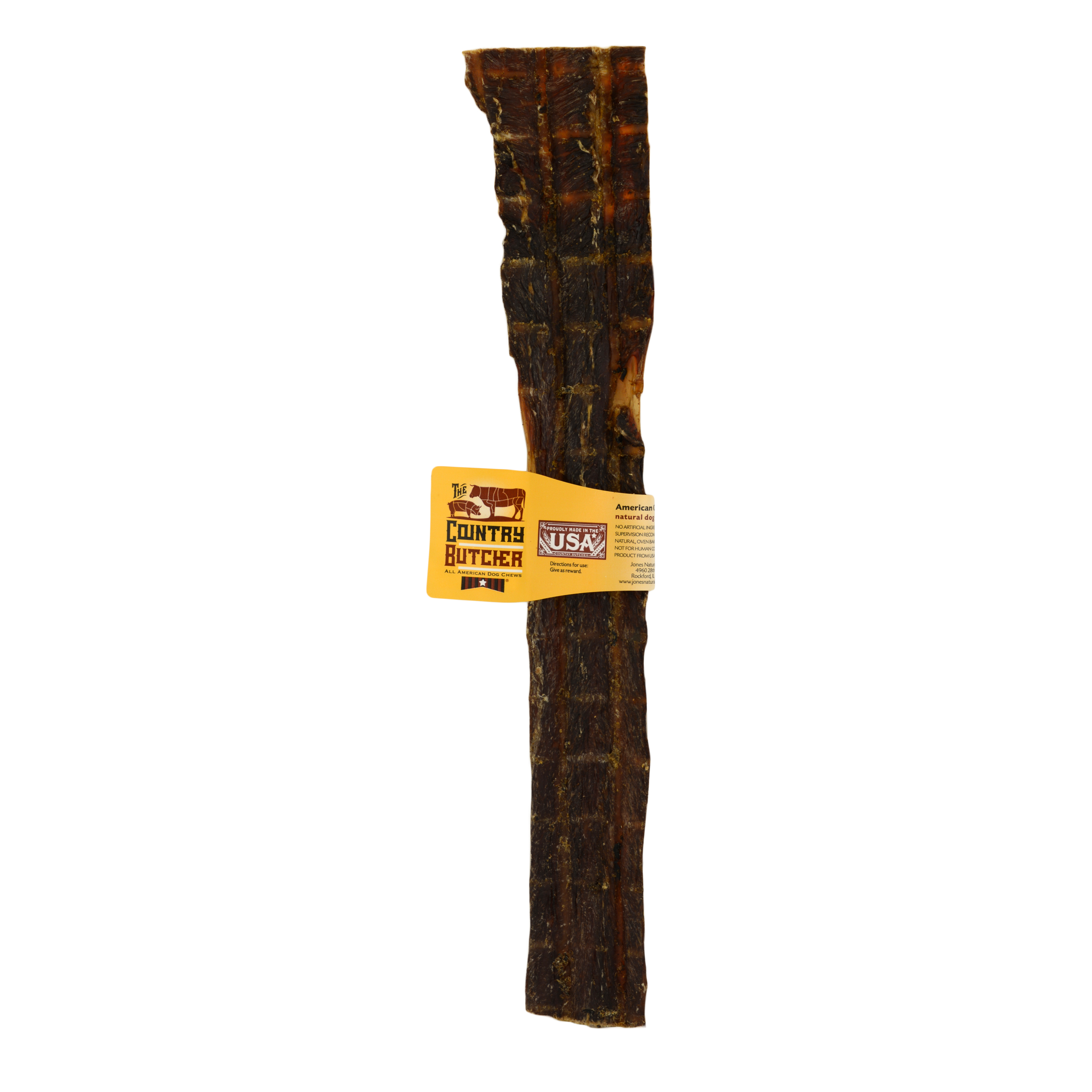 Weasand Jerky is a 100% digestible beef chew that offers an enjoyable snacking experience. This chew makes a wonderful addition to any dog’s diet, adding extra protein while also containing glucosamine and chondroitin – active ingredients in joint supplements. This chew is cut from USA-Raised beef esophagus that is slow-roasted to perfection. The hand-cut strips are flat with a jerky-type texture, available at four different lengths, to provide an optimal chewing session for any size dog.