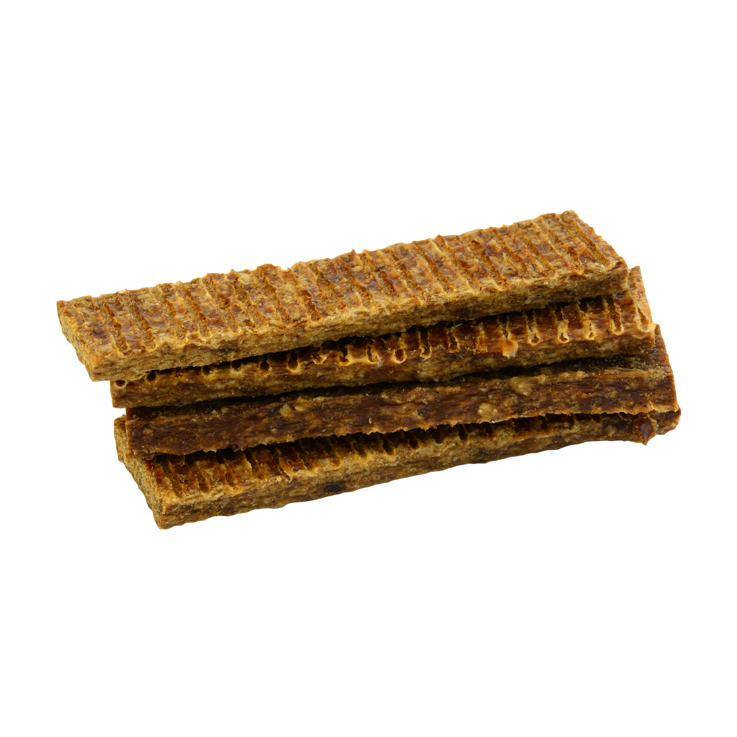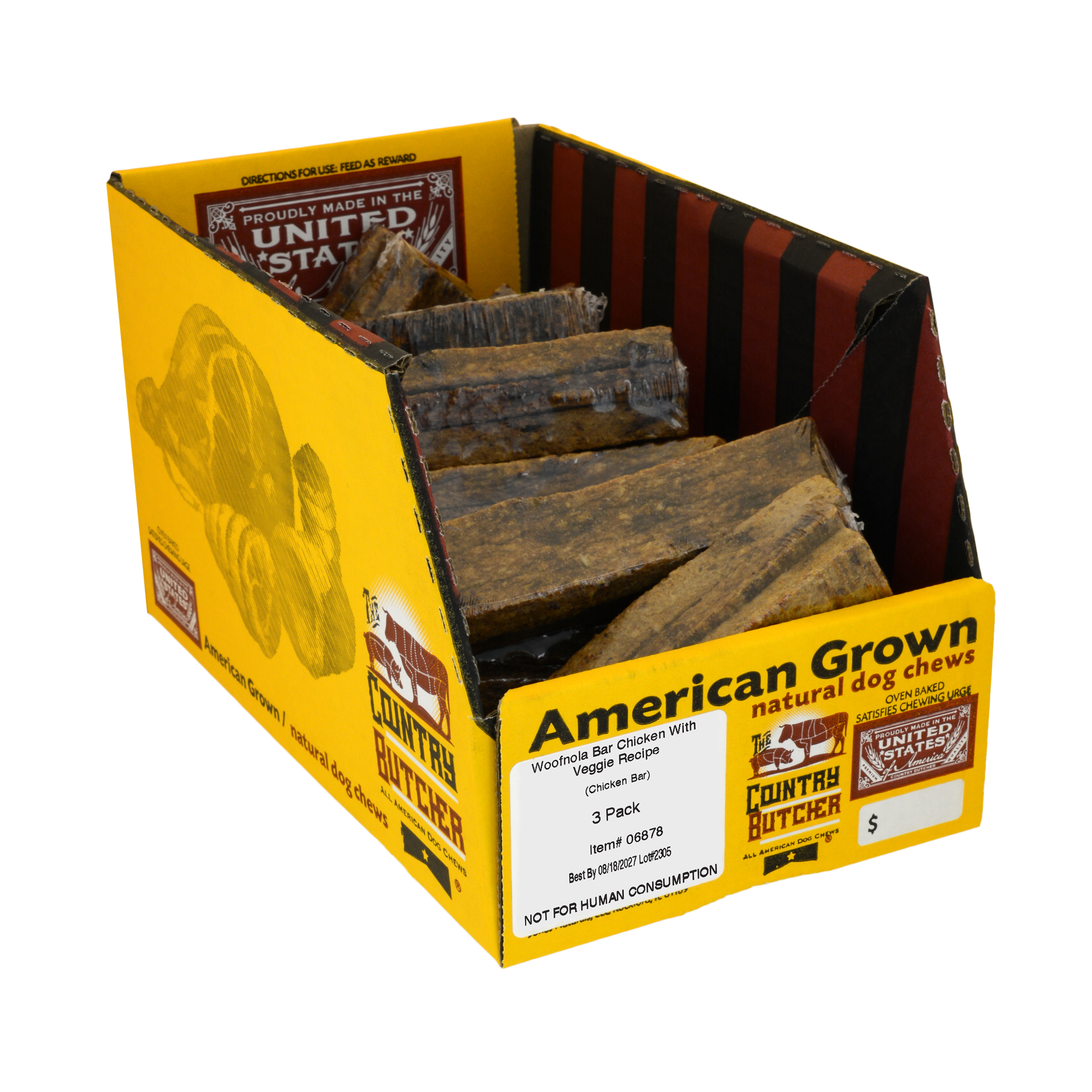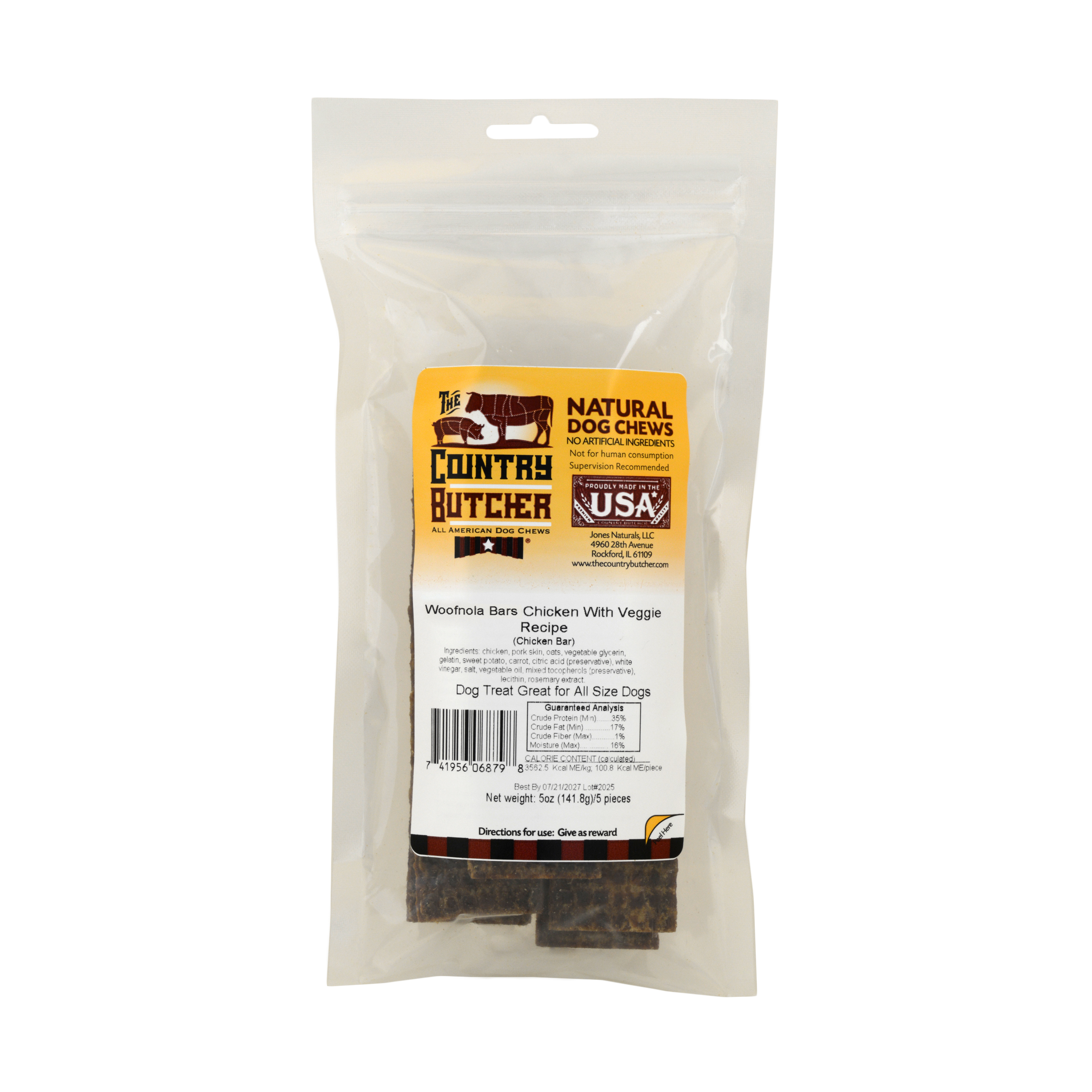 Woofnola Bars Chicken With Veggie Recipe are doggie granola bars, natural dog treats that feature USA-raised chicken as the first ingredient next sweet potato, carrots and rolled oats are added to create a well-rounded, nourishing treat. The addition of real vegetable bits creates a varied texture that lends itself to an enjoyable chewing experience. The down-home flavor combination is a dog favorite, while dog parents can appreciate the wholesome ingredient listing, especially the extra protein from chicken and beta carotene from the carrots. These oven-baked bars break apart for sharing or use in training situations and they are great for on the go!
